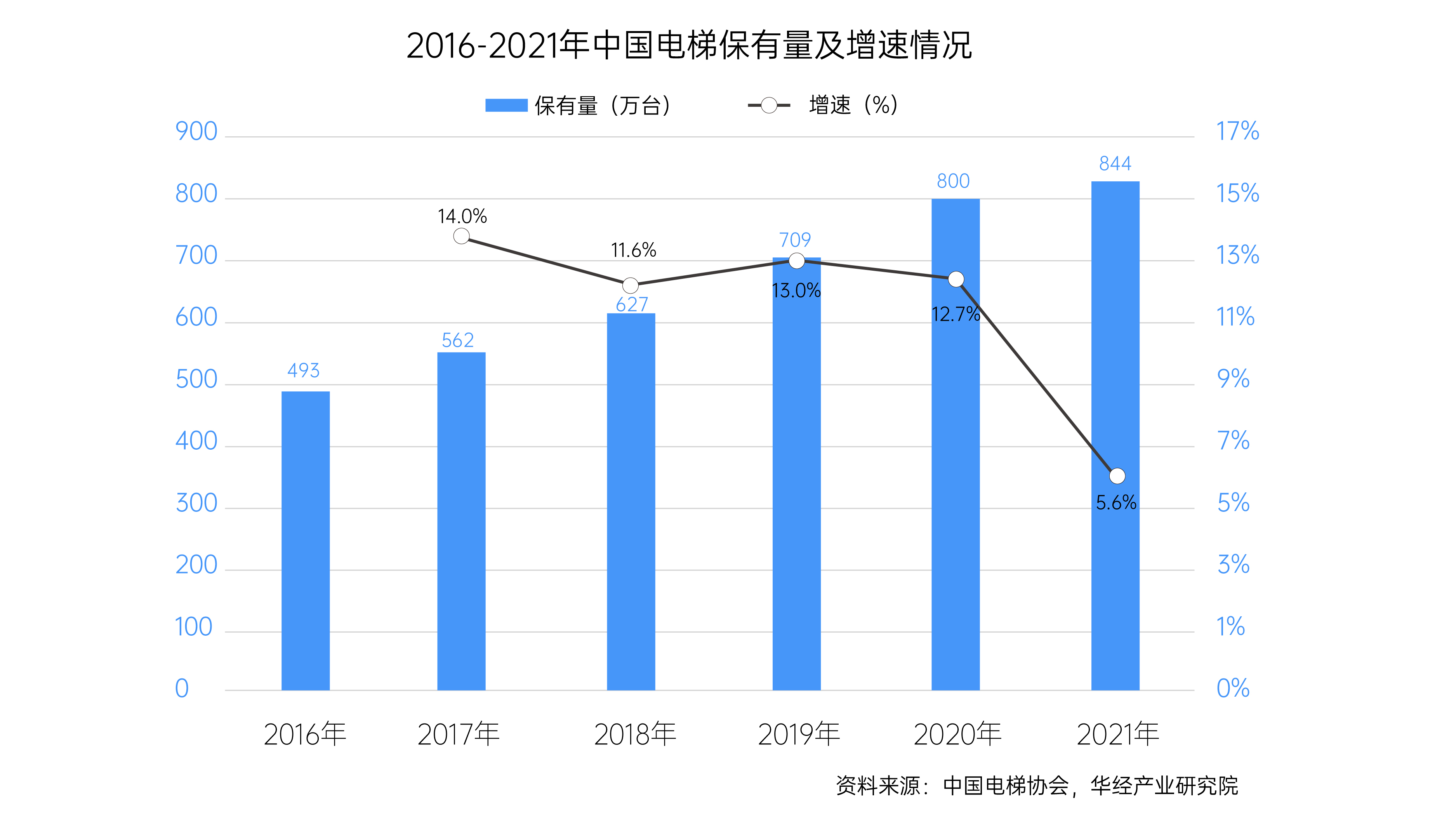 資料顯示,2021年我國電梯保有量為844萬臺,同比增長5.6%。在人口基數(shù)較大,人均電梯使用保有率提升,以及人口老齡化加重,老舊小區(qū)持續(xù)推進(jìn)電梯新裝等背景下,我國電梯行業(yè)也迎來了增長的重要契機(jī)。